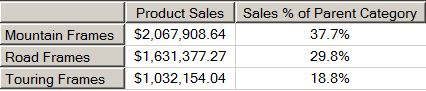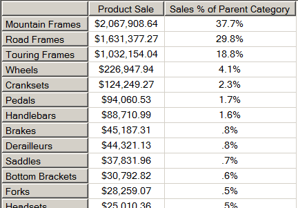 ,[Measures].[Sales % of Parent Category]) ON ROWS