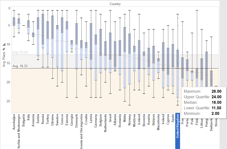 I loaded the raw data into Tableau and create a box-and-whisker plot to compare the average place of each country participated in the contest.
