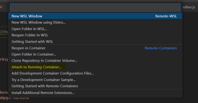 Start VS code window, open the “command palette”, and select “Remote-Containers: Attach to Running Container…”.