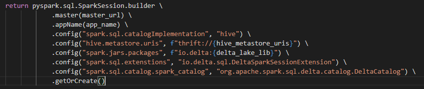 Here is the code for creating a SparkSession instance with the support of Delta Lake.
