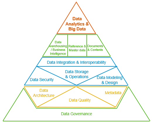 Based on the functional areas defined by the DAMA Wheel, Peter Aiken developed the DMBOK pyramid that defines the relation between those functional areas.