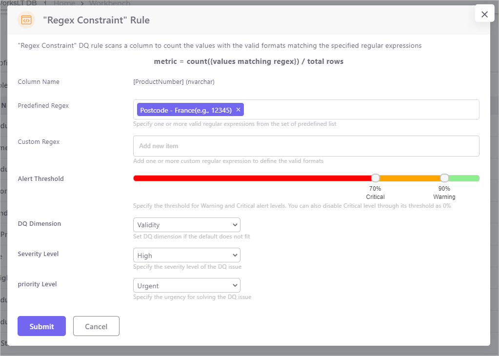 DQ metrics are the numerical representations of an aspect of the quality of a dataset. The Metric formula defines the calculation to determine the number. In the Regular Expression constraint rule example, the metric could be defined as the count of column values that comply with the regex divided by the count of rows in the dataset.