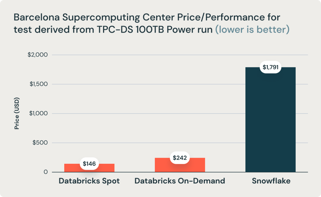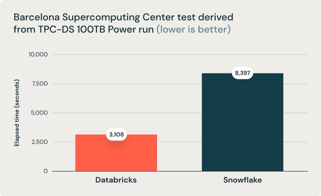 In the 100TB TPC-DS performance benchmark test for data warehousing, Databricks SQL outperformed the previous record by 2.2x. In a separate test conducted by Barcelona Supercomputing Center, Databricks SQL demonstrates 2.7x faster and 12x cheaper than snowflake on the same data warehousing workloads.