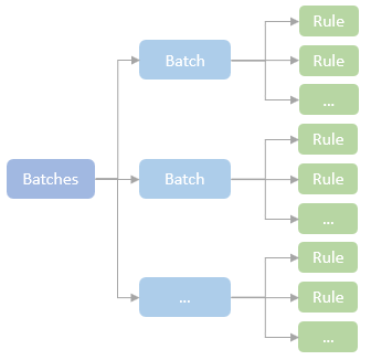 A RuleExecutor contains a batches property, which is overridden by the subclasses, Analyzer or Optimizer, for defining a sequence of rule batches, each of them contains a list of Catalyst rules.