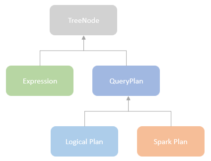 QueryPlan, the parent for both LogicalPlan and SparkPlan, is a subclass of TreeNode type. That means the logical plan and the spark plan involved in the Spark SQL query execution process are recursive tree structures. The process for transforming a query plan from one stage to another stage, e.g. from a resolved logical plan to an optimized logical plan, is the process of applying rules for transforming the nodes or subtrees.