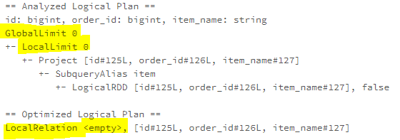 The “OptimizeLimitZero” batch is a single rule batch as well, which includes the OptimizeLimitZero rule. This batch handles the case where GlobalLimit and LocalLimit have the value 0. The GlobalLimit 0 and LocalLimit 0 nodes imply an empty result set, therefore no data is needed to actually read from a data source. In this case, the OptimizerLimitZero rule will prune the node below the GlobalLimit or LocalLimit.