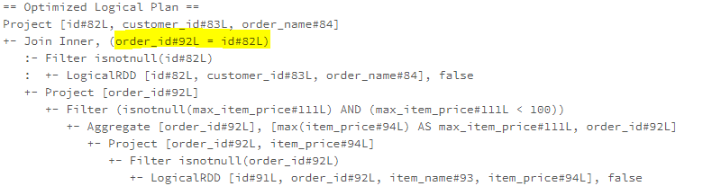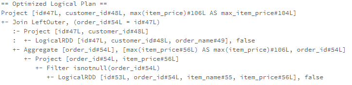 The PullupCorrelatedPredicates rule is one of the Optimizer rules for optimising correlated scalar subqueries, which pulls all outer correlated predicates from a subquery and moves them to the upper level. Another rule involved in the correlated scalar subqueries is the RewriteCorrelatedScalarSubquery rule, which rewrites the correlated subquery to the join. The RewriteCorrelatedScalarSubquery rule is executed in the “Operator Optimization” batch, which will be covered in the following blog posts.