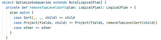 The OptimizeSubqueries rule optimises all the subqueries inside expressions. For Spark 3.0.0, only one subquery optimisation case is implemented, which removes Sort operator from a subquery, because the results produced by a subquery are un-ordered.