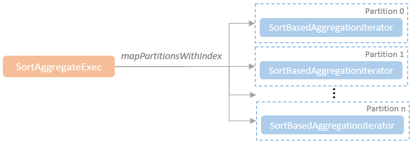 Once the rows are sorted, the aggregate operator can start to process the rows for the physical aggregation. Internally, for each partition, a SortBasedAggregationIterator is created for evaluating the aggregate functions.