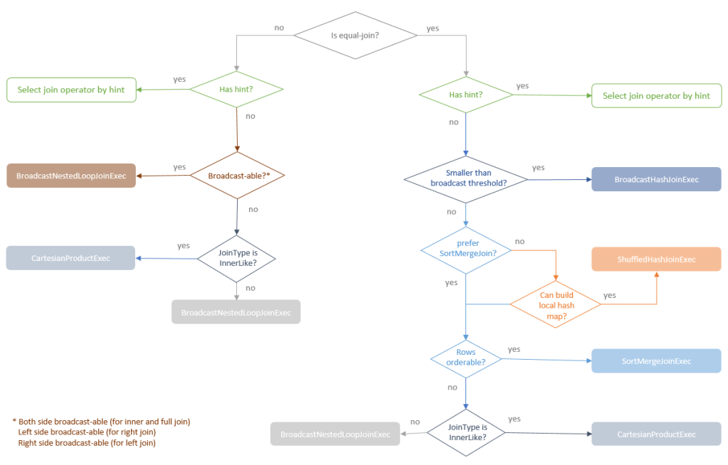 Based on the Join strategy selection logic implemented in the JoinSelection object (core object for planning physical join operations), I draw the following decision tree chart.