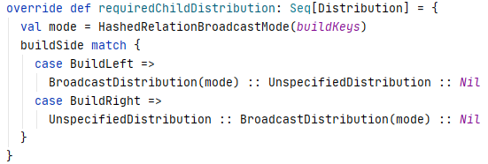 Internally, the BroadcastHashJoinExec overrides the requiredChildDistribution method and declares the broadcast distribution requirement of the relation to broadcast.