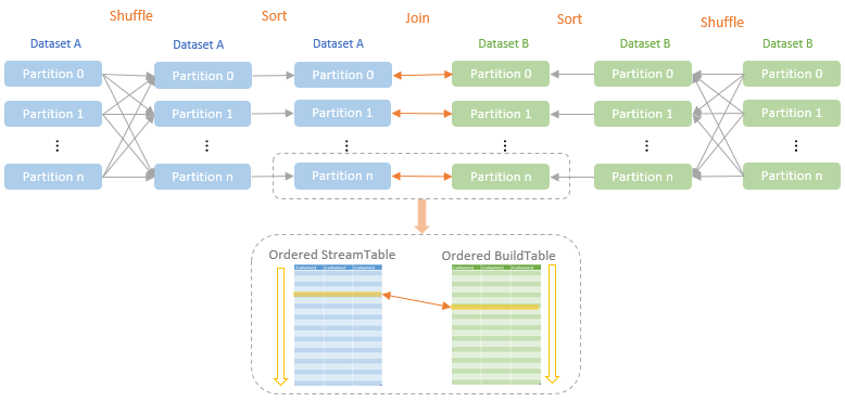 Either of the two join relations can be used as StreamTable or BuildTable. When a relation is used as the StreamTable of the join, it is iterated row by row in order. For each StreamTable row, the BuildTable is searched row by row in order as well to find the row with the same join key as the StreamTable row. As both the StreamTable and BuildTable are sorted by the join keys, when the join process moves to the next StreamTable row, the search of the BuildTable does not have to restart from the first BuildTable row, but instead, it just needs to continue from the BuildTable row matched with the last StreamTable row.