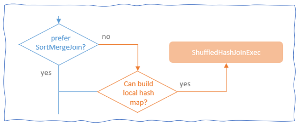 If the condition for selecting Broadcast Hash Join strategy is not met, the selection flow moves to check whether the Shuffle Sort Merge strategy is configured as preferred or not. if not, it exams whether the condition for using Shuffle Hash Join strategy is met.