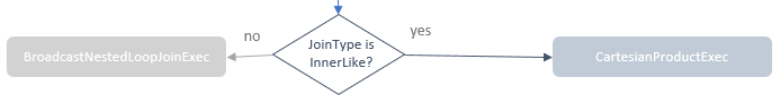 If a Join Hint is specified in the join query, select the corresponding Join strategy according to the Join Hint. Otherwise, if one or both sides of relations are small enough to broadcast, select the Broadcast Nested Loop Join strategy and broadcast the smaller relation. If no relation is small enough to broadcast, check whether the JointType is InnerLike or not. If so, select the Cartesian Product Join strategy. Otherwise, fall back to the There are only two Join strategies supporting Non Equi-Join type, the Cartesian Product Join and the Broadcast Nested Loop Join strategy as the final solution.