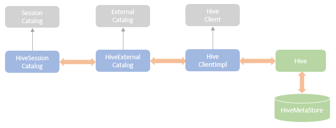 SparkSession uses the CATALOG_IMPLEMENTATION setting to choose the corresponding session state builder for building the SessionCatalog implementations. When the hive support is enabled, a HiveSessionCatalog instance is created for the current SparkSession. This HiveSessionCatalog instance creates an instance of the HiveExternalCatalog, the Hive implementation of ExternalCatalog, which contains the interface for interacting with the underlying Hive metastore.