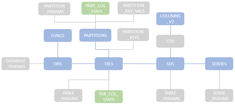 - TBLS – stores the metadata of tables. The associated TABLE_PARAMS table stores table parameters. The associated TAB_COL_STATS stores statistics of table columns.