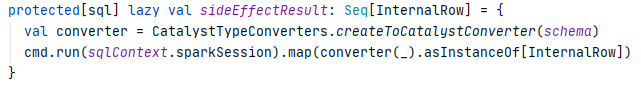 The RunnableCommand is a logical plan which is not executable. The physical execution of the runnable commands is run by the ExecutedCommandExec physical operator. A lazy field, sideEffectResult, is defined in the ExecutedCommandExec, which wraps up any side effects caused by the run method execution of the command. The sideEffectResult variable is referenced in the doExecute method so that the command run method can be executed eagerly.