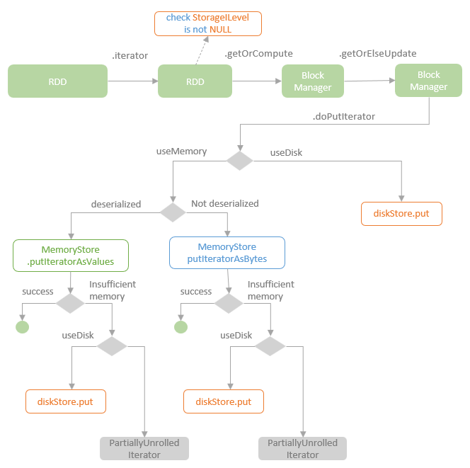 The doPutIterator method persists the cache block according to the given storage level. If the given storage level supports to use memory, depending on whether the storage level support serialisation or not, the putIteratorAsValue method of the MemoryStore instance for saving deserialised data or the putIteratorAsBytes method for saving serialised data is called. When the data to cache is too big to fit into the memory, if the given storage level supports to use disk, persist the data to the disk store instead. If the storage level does not support to use disk, the persist operation is failed and the input data iterator is returned back to the caller so that the caller can decide the alternative solutions.