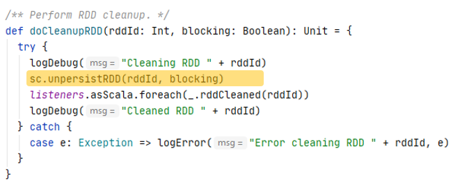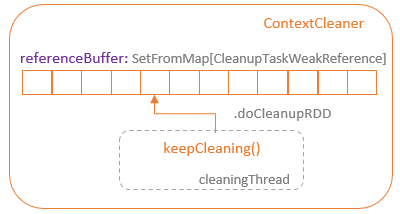 When an RDD is not used anymore and there is no strong reference of it exists, the GC process will release the resources allocated for this RDD. When the RDD (the definition of a dataset excluding the actual data) is removed, its cached data is not useful as well, but it still occupies the storage resources, either memory or disk. Spark provides the ContextCleaner, which manages the release of unused cache resources. The ContextCleaner contains a referenceBuffer queue, which is backed by a SetFromMap of CleanupTaskWeakRference type objects. When GC collects an unused RDD, a weak reference of this RDD is added into the referenceBuffer queue.