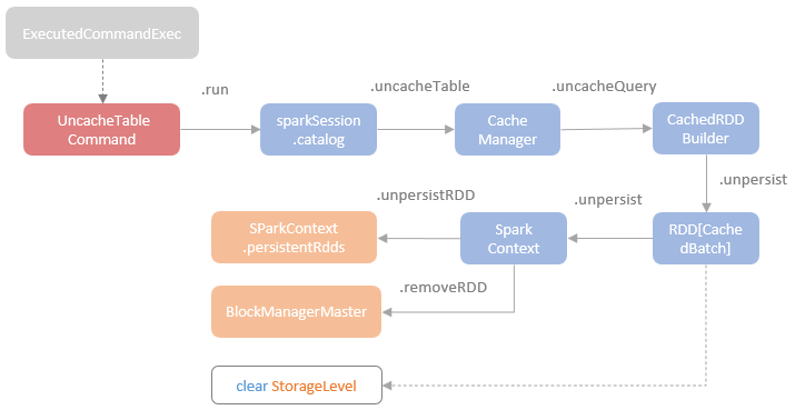 When an uncache statement is submitted, an UncacheTableCommand logic plan is created and is executed by the ExecutedCommandExec operator. Running the UncacheTableCommand follows the same execution chain as the CacheTableCommand but calls the uncache*** methods instead of the cache*** methods, as shown in the following chart.