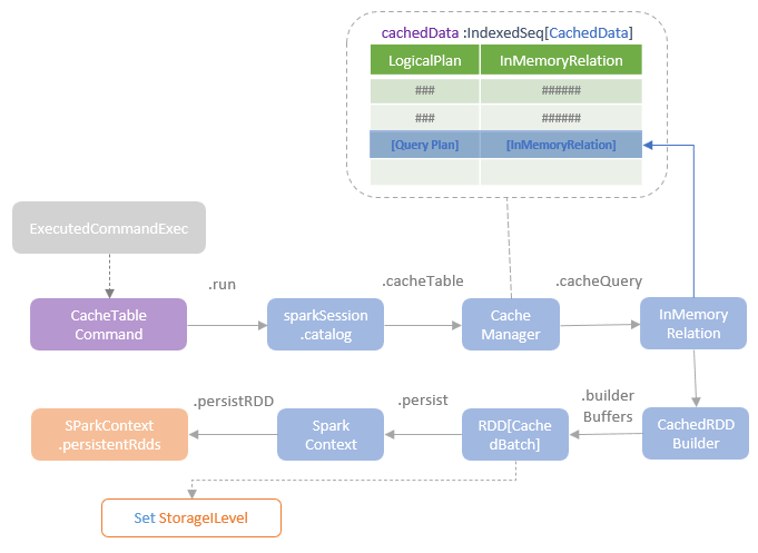 The CacheManager maintains the list of cached plans in the CachedData type as an immutable sequence. A CachedData instance holds a cached logical plan and an InMemoryRelatoin instance created for this logical plan. The InMemoryRelation instance references the CacheRDDBuilder instance created for building the RDD of the CachedBatch, RDD[CachedBatch] which is the data structure for a batch of cached rows. The buildBuffers method of the CachedRDDBuilder defines the logic for executing the logical plan, batching the result rows for caching and returning the RDD[CachedBatch]. The persist method of RDD[CachedBatch] is called at this moment. However, as persist operation is lazily executed, the Cache RDD building process is just defined but not physically executed yet.