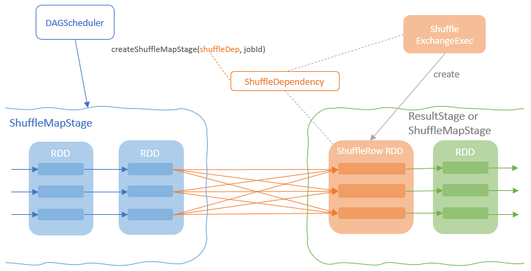 At a high level, the ShuffleExchangeExec operator is mainly responsible for two things. First, prepare the ShuffleDependency that partitions the output rows of the child node based on the partitioning scheme required by the parent node. Second, add a ShuffleRowRDD and specify the prepared ShuffleDependency as the dependency of this RDD. During the job scheduling stage, the DAGScheduler detects the ShuffleDependency of the ShuffleRowRDD and create a ShuffleMapStage that wraps the upstreaming RDDs and produce data for the shuffle operation defined in the ShuffleDependency.