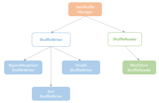 ShuffleManager defines the interface for creating the shuffle writers and shuffle readers. Since Spark 2.0, the SortShuffleManager has been the only implementation of the ShuffleManager trait and the old hash-based shuffle approach, which could generate an unmanageable number of shuffle files, was not supported any longer. On the map side, SortShuffleManager provides three shuffle writers, the BypassMergeSortShuffleWriter, the UnsafeShuffleWriter, and the SortShuffleWriter.