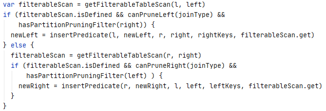 The PartitionPruning rule first checks whether the DPP is applicable or not based on the type and selectivity of the join operation. It starts from checking the applicability of the DPP on the left side of the join. Firstly, the getFilterableTableScan method is used to ensure the left-side table scan can be filtered for a given column. The table scan needs to be either a V1 partitioned scan for a given partition column or a V2 scan which supports runtime filtering on a given attribute. Then the join type is checked by the canPruneLeft method to ensure the join type supports pruning partitions on the left side (the join type needs to be either Inner, LeftSemi, or RightOuter for supporting left side partition pruning). Meantime, the hasPartitionPruningFilter method is used to check whether the right-side of the join has selective predicate which can filter the join key. When all of the above checks are passed, the PartitionPruning rule calls the insertPredicate method to insert predicate on the left side of the join. If no, the same checks are conducted on the right side to evaluate the applicability of the DPP on the right side.