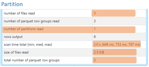 Compared the results, we can see the query on the partitioned table only read one partition of the table while the query on the table without partitioning has times higher number, size and scan time of the files read.