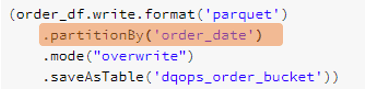 In this example, a dataset is partitioned by the ‘order_date’ column (even though, in a real world project, partitioning by a year-month-day directories hierarchy could provide a more flexible granularity option, we directly use the date column for the sake of simplicity to explain the partitioning concept), and saved as parquet format.