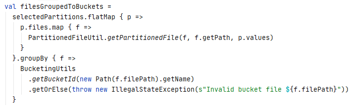 Then a FilePartition, an RDD partition, is defined for each of the remaining buckets after the pruning. The list of defined FilePartitions for the buckets is then passed into the constructor of the FileScanRDD to define the partitions of the FileScanRDD so that the output partitions from the FileScanRDD are in line with the data distribution defined by the bucketing specs.