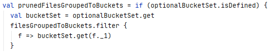Next, the grouped files are filtered based on bucket set for bucket pruning.