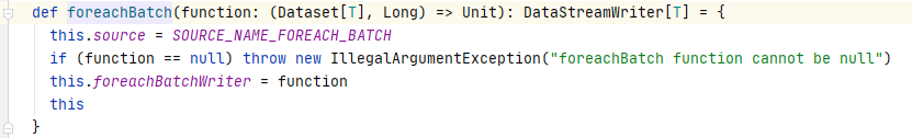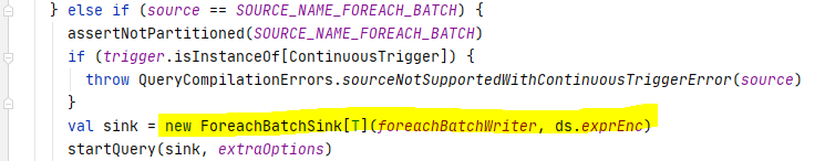 When the streaming query is being initialised, the ForeachBatchSink instance is created using the specified custom function as the writer.