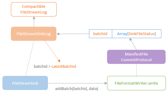When the addBatch method of the FileStreamSink is called, it first fetches the id of the latest committed batch and compares to the id of the current batch. If the latest batch id is larger or equal to the current batch id, it means the current batch has been committed before, so the current batch needs to be skipped to avoid duplications in sink.