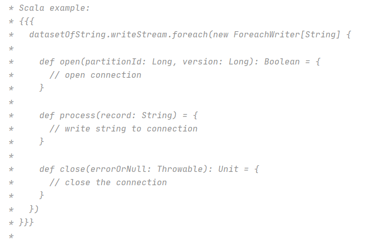 The custom writing logic defined in the sub-class will be executed for each task on executors, therefore, an instance of the sub-class will be initialised by each partition. Three methods in the base ForeachWriter class need to be implemented in the sub-class: