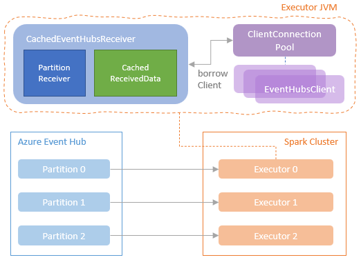 Thanks to the feature that a partition can be processed by the same executor across batches, the Event Hub receivers and the connections to event hub service can be cached and reused. On Spark executor, a map of Event Hubs connection strings to their corresponding ClientConnectionPool instances is maintained. A ClientConnectionPool instance created for a Event Hub connection string holds a ConcurrentLinkedQueue of EventHubClient instances for reuse across batches. When a client borrow request is raised to the ClientConnectionPool instance, if there is client available, the client will be returned to the borrower. If no, a new client will be created and provided to the borrower. On the Spark Executor side, the borrower is a CachedEventHubsReceiver instance.
