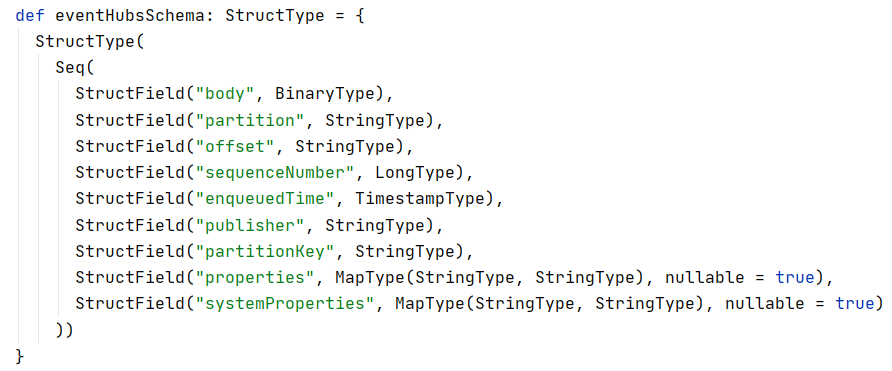 The EventHubSource class implements the Spark source trait, including the concrete implementation of the core methods (getOffs and getBatch) and property (schema). The schema of an Event Hub message is defined by the EventHubSourceProvider and is fixed and standarised across all Event Hub messages.