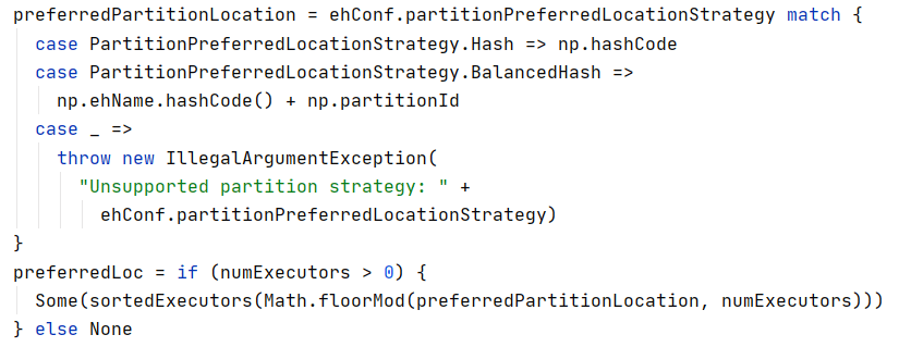 In addition, the EventHubsSource implements the partition preferred location strategy which is capable to allocate each partition to the same executors across all batches. This is an important feature that ensures the event hub receiver can be cached and reused efficiently on Spark side. The hashcode of the Event Hub partition identity (a NameAndPartition object consists of Event Hub name and partition id) is used to determine the executor to allocate the partition (the hashcode mod the number of executors and use the reminder as the index to fetch the executor from the sorted list of all the executors). While this approach is able to assign a partition to the same executor across batches, the allocation of the partitions to allocators might not be balanced, some are allocated with many partitions and some are assigned with nothing. One improved strategy is to only hash the event hub name and then add the event hub partition id to it. As the partition ids in Event Hub is sequential, the mod operation will ensure those partitions are balanced across the Spark executors.