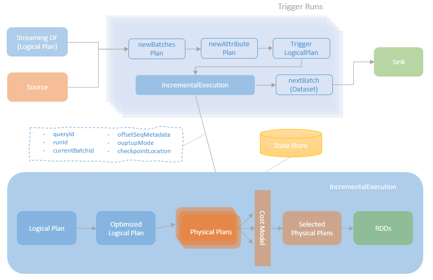 Internally, the IncrementalExecution is a sub-class of the QueryExecution, which is designed to reuse the core analysis, optimisation, and planning components and rules that are initially developed for executing one-off batch queries. In the meantime, the IncrementalExecution extends the QueryExecution to enable the update of the execution plan with a new batch of data and maintain query states between batches.