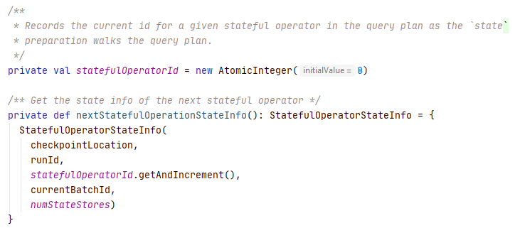 Apart from the preparation rules inherited from the QueryExecution, the IncrementalExecution also defines rules for preparing stateful operations that add the state info to the stateful operators. As mentioned above, for each micro-batch execution, an IncrementalExecution instance is created. The metadata or the streaming query and the current batch, such as runId, currentBatchId, and checkpointLocation are passed in the IncrementalExecution instance when it is created. In addition, an IncrementalExecution instance maintains an incremental integer, statefulOperatorId, and a nextStatefulOperationStateInfo method. When the nextStatefulOperationStateInfo method is called, the statefulOperatorId is auto incremented by 1 and is used along with the other metadata mentioned above for defining an StatefulOperatorStateInfo instance, which is used to identify the state store for a given operator.