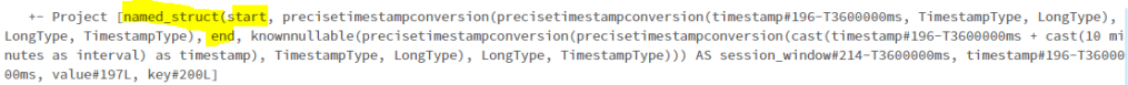 Internally, Spark creates a SessionWindow expression to represent the session_window, which defines a named_struct containing the “start” and “end” fields representing the start and end of a session window. Spark Catalyst Analyzer generates the logical plan for generating session window on the event timestamp column with each session window initially defined as [“start” = timestamp, “end” = timestamp + session gap].