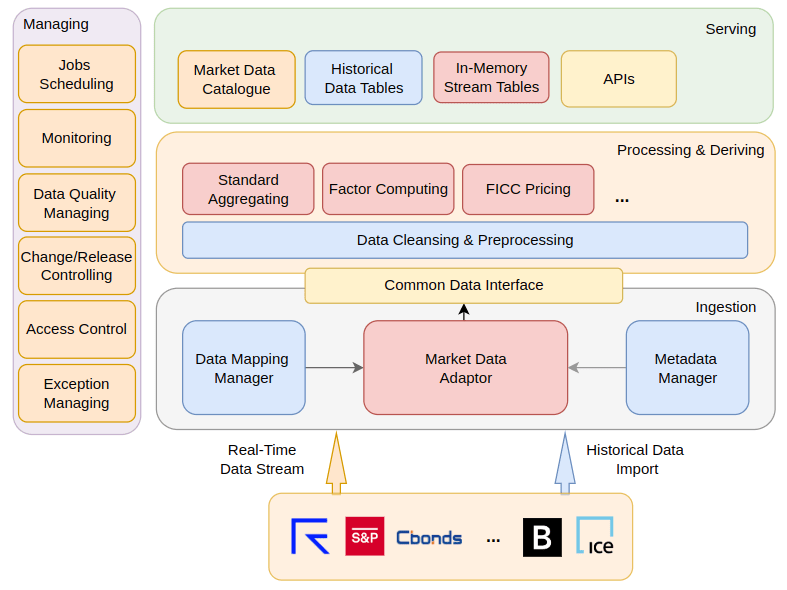 - Processing Layer – In this layer, the data received from the ingestion layer will be cleansed and preprocessed according to a set of predefined, generic rules. The processed data can be further aggregated based on standard time intervals. Different preprocessing or aggregation rules can be applied to market data for various asset classes or security products, which can be specified through metadata or data mapping configurations. The derived data will be calculated in this layer; however, it will not utilize the metadata-driven framework. Instead, the processing pipeline for derived data will be developed as separate modules, potentially in the form of plugin packages.