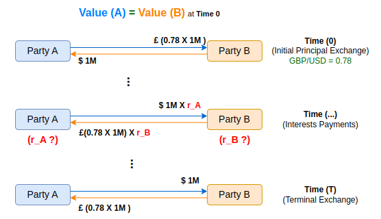 - Principal Exchange (time 0) – the two parties exchange the notional amount of principal in their respective currencies.