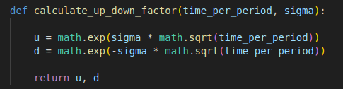 The formula assumes that price movements follow a geometric Brownian motion (GBM) model, where the price of the asset changes randomly but with a predictable distribution of possible changes. The GBM is not the focus of this blog post, but I plan to write a dedicated blog post to simulate the GBM model. The up and down factors are typically determined using volatility and the time step, where volatility (sigma) indicates the degree of variation in the asset’s price.