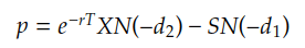 option_price = k * exp(-r * T) * cdfNormal(0, 1, -d2) - s * cdfNormal(0, 1, -d1)