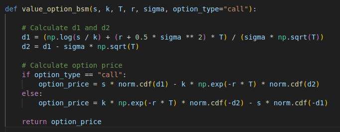 The code implementation of the BSM formula is pretty simple. Here is the Python code implementation.
