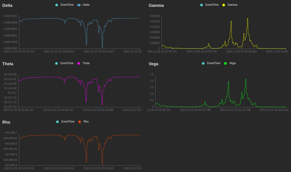 DolphinDB comes with an impressive real-time dashboard feature, which we can use to create real-time, animated charts for visualizing the Greeks values we output to the GreeksTable.