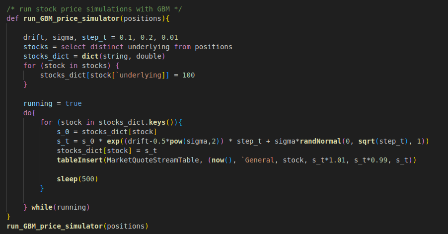 We will use GBM to simulate stock price movements. Please refer to Coding towards CFA (9) – From Binomial Model to BSM for an explanation of why and how we use GBM. The simulated stock prices will be ingested into the market quotes stream table.