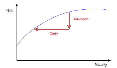 The CFA curriculum breaks the total return of a fixed-rate bond into three components: coupons, interest from coupon reinvestment, and capital gains from selling the bond prior to maturity. The first two components represent the ‘Carry‘ return of the bond, which compensates the investor for the time value of money, while the last component is the ‘Roll-Down‘ return, which results from the interest rate fluctuations in the bond’s price.