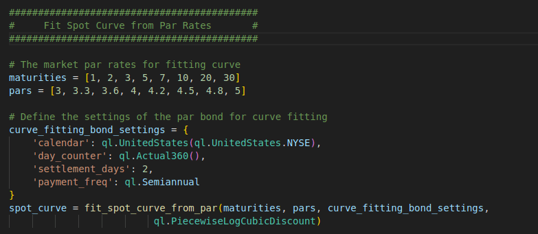Now let’s look into the code. First, we need fit the spot curve from the market rates. Here, we can reuse the fit_spot_curve_from_par function we created in the previous blog post. The full code of the function can be found at the bottom of this page.